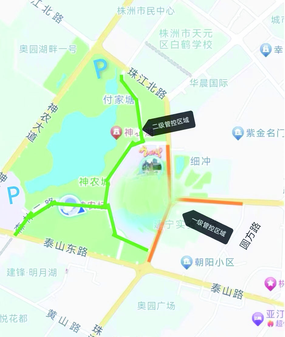 二级管制区域为珠江北路(华人街一侧)森林路口至珠江南路(教育路口一侧)森林路口,高德路森林路口至泰山路森林路口。