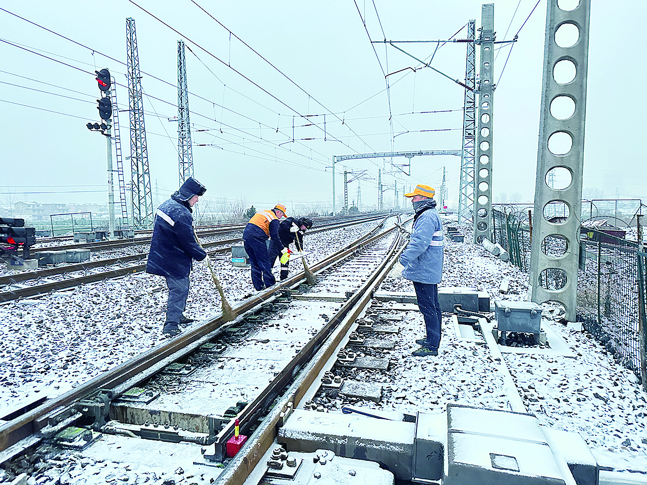 2月1日,淮南西站管内口孜集站职工在清扫线路道岔积雪。 新华社发
