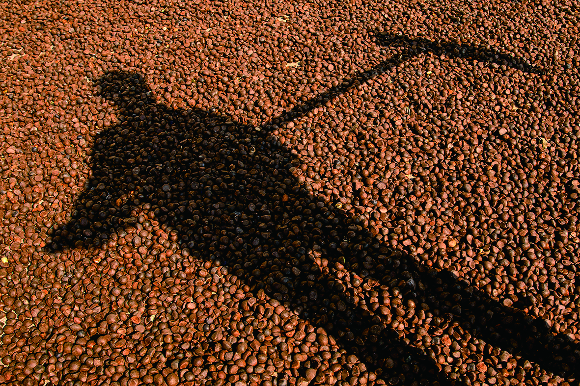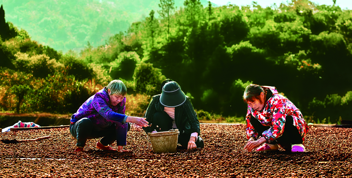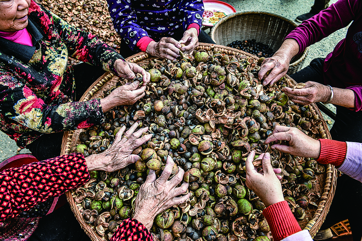 阳光在茶籽上映射出农户忙碌的身影。 廖威 摄