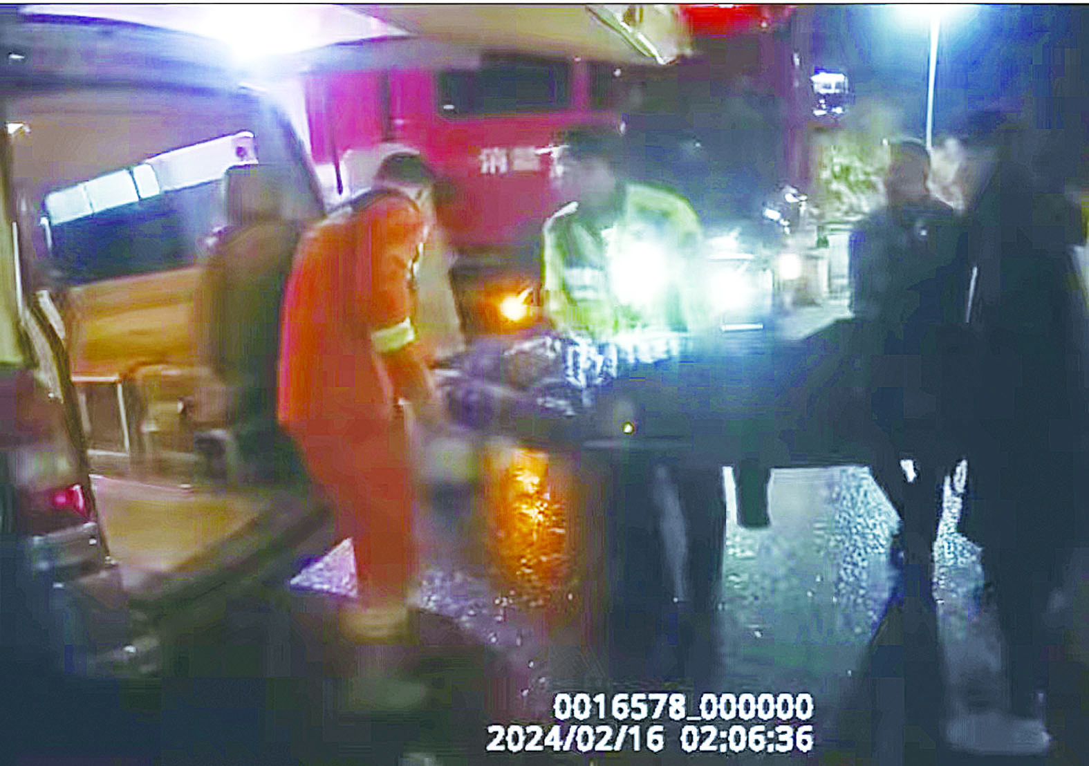 辖区管理所工作人员带来一个软垫子,大家再次将伤者身体包好放在垫子上,并用绳子固定好以防摔倒。通过斜坡上行,大家利用绳索慢慢将伤者抬上路面,再将其转运至在中村收费站等候的救护车上,此时已是凌晨2时许。