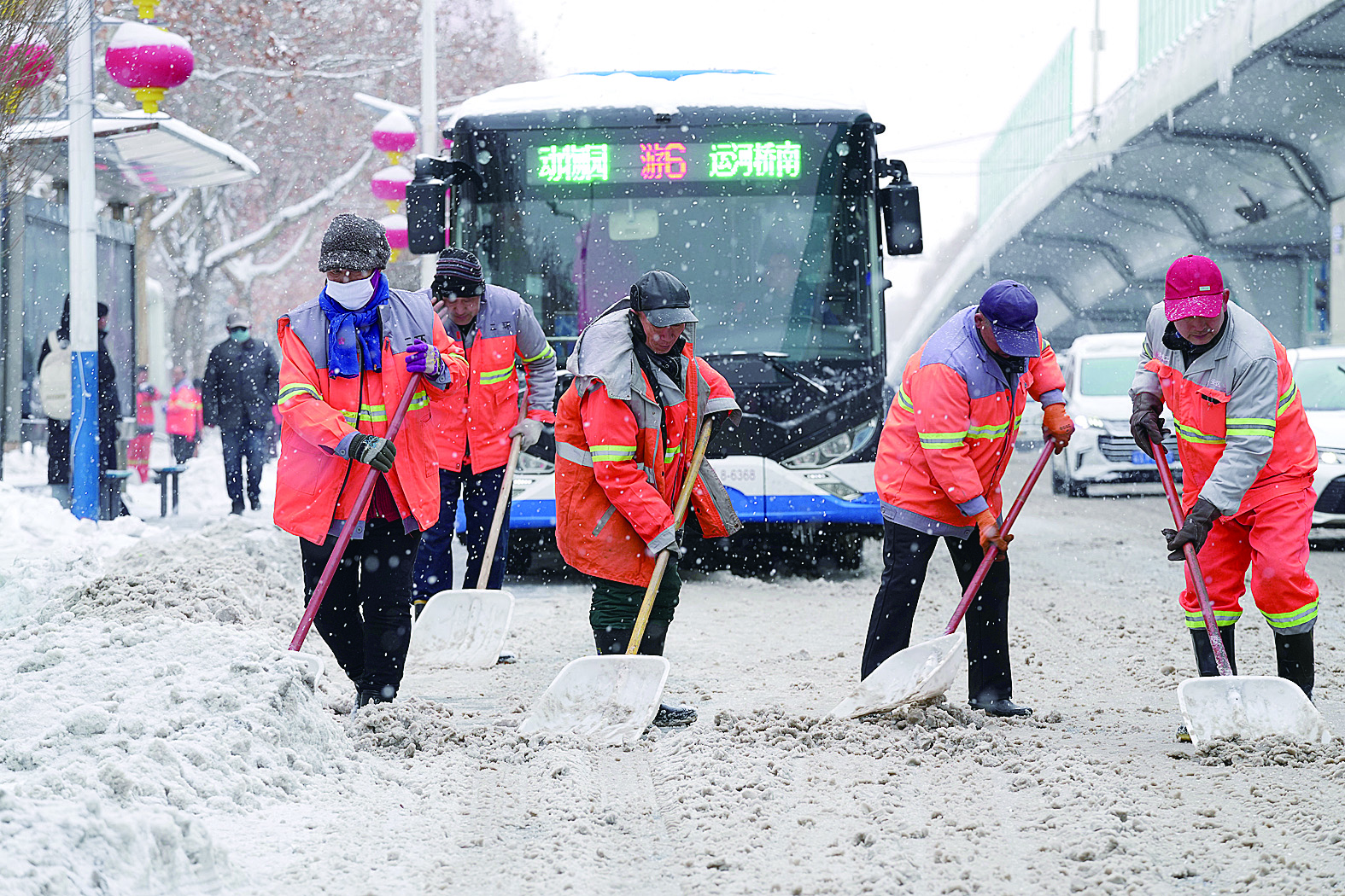 2月21日,在河北省石家庄市,环卫工人清理路面积雪。新华社发