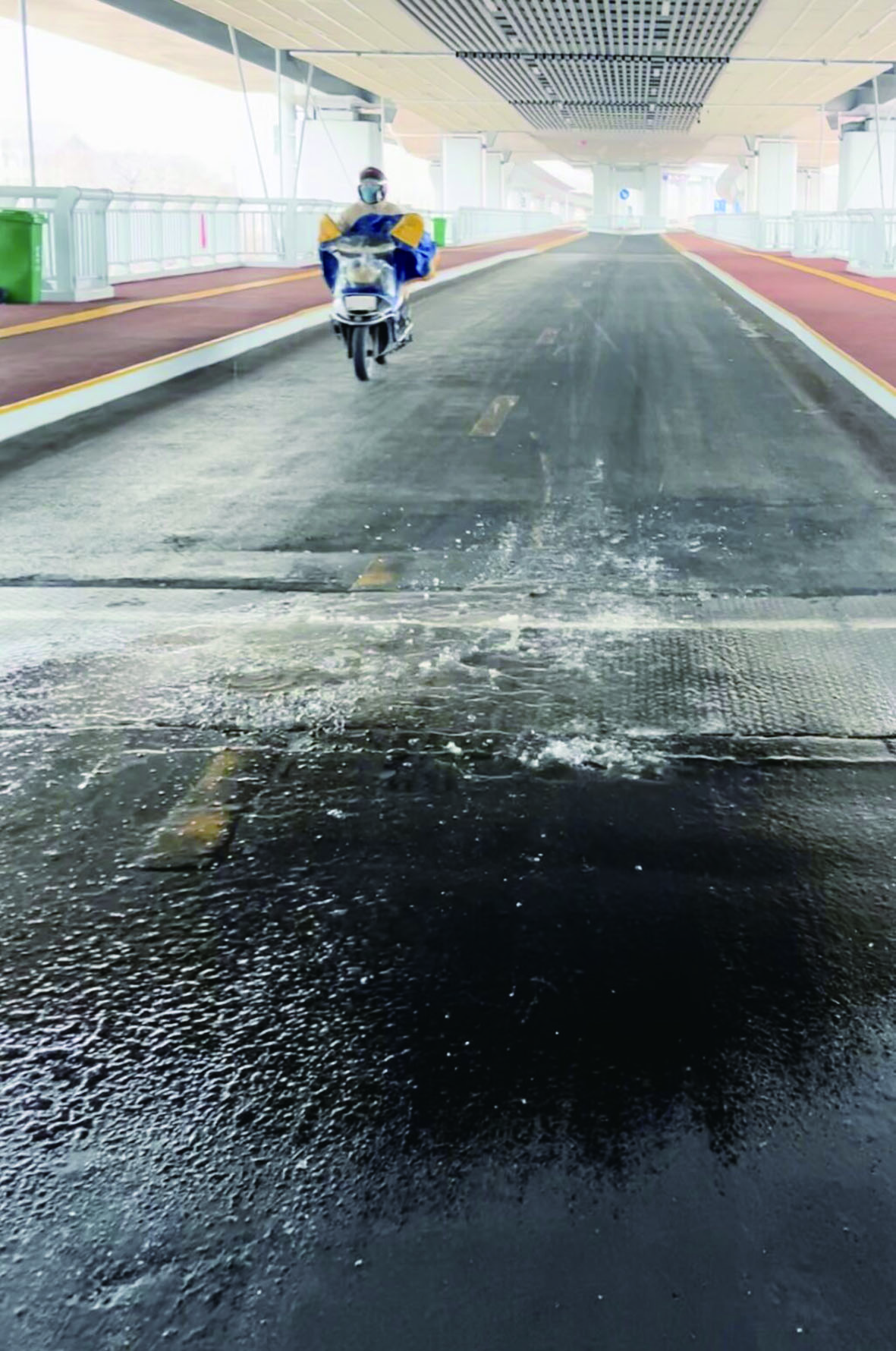 2月23日,受寒潮影响,低温天气持续。清水塘大桥(株洲八桥)景观通道部分路段因有水滴漏,出现地面结冰、通道上方挂有冰凌现象。游玩市民及过往非机动车辆要注意避让,确保安全。