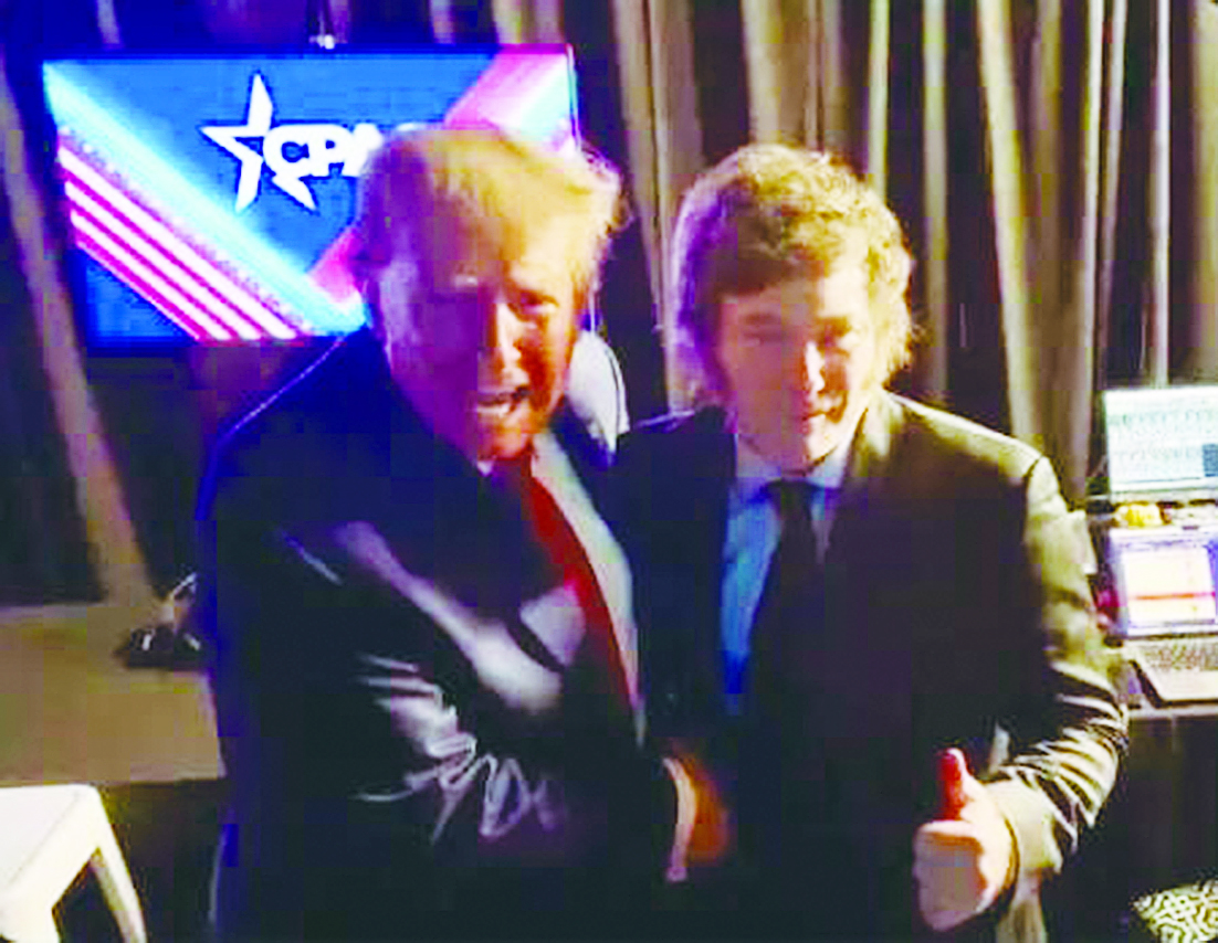 根据米莱在社交媒体转发视频,特朗普对米莱表达了高度肯定,告诉众人“他(米莱)是一名MAGA”,并对着米莱说,“让阿根廷再次伟大”。