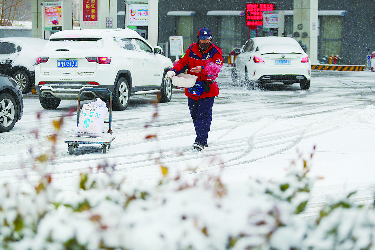 2月1日,河南省商丘市的一名加油站工作人员在撒盐除雪。 新华社发(李恒 摄)