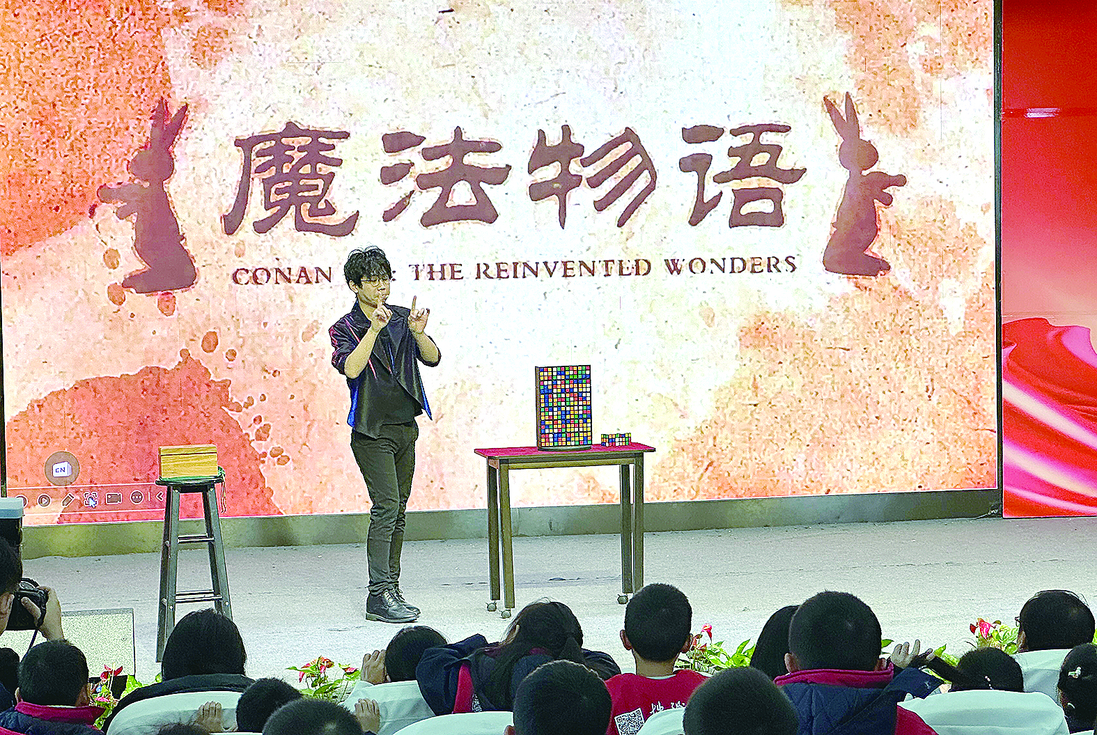 活动中,魔术师刘果楠的表演让整个会场顿时沸腾了。一个个魔方在魔术师的手中一会儿眨眼间还原,一会儿变幻成“梦”字。