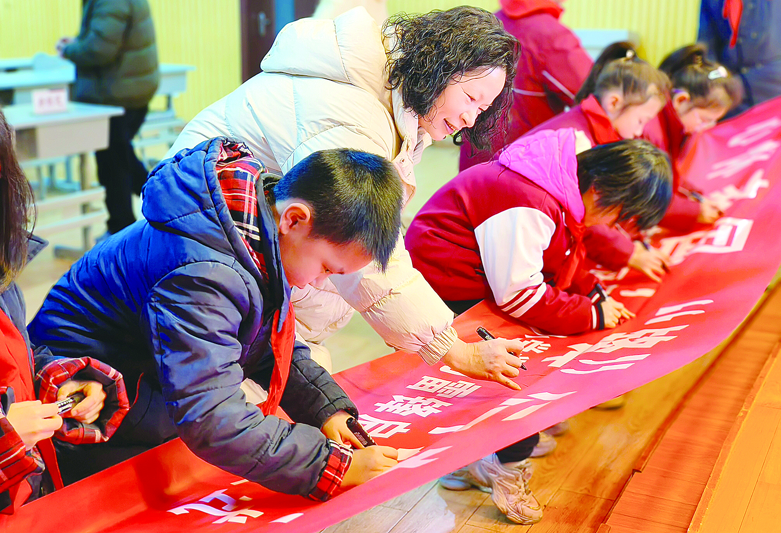 同学们签名参与活动。 记者/戴凛 摄