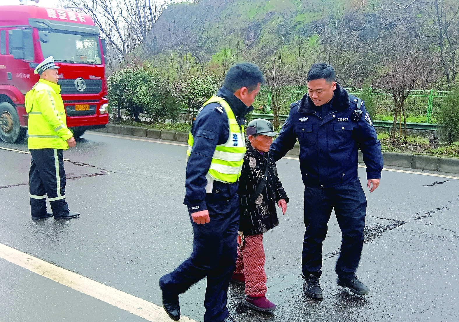 石峰交警在快速路上救助走失的老人。记者/沈全华 通讯员/胡胜兰 摄