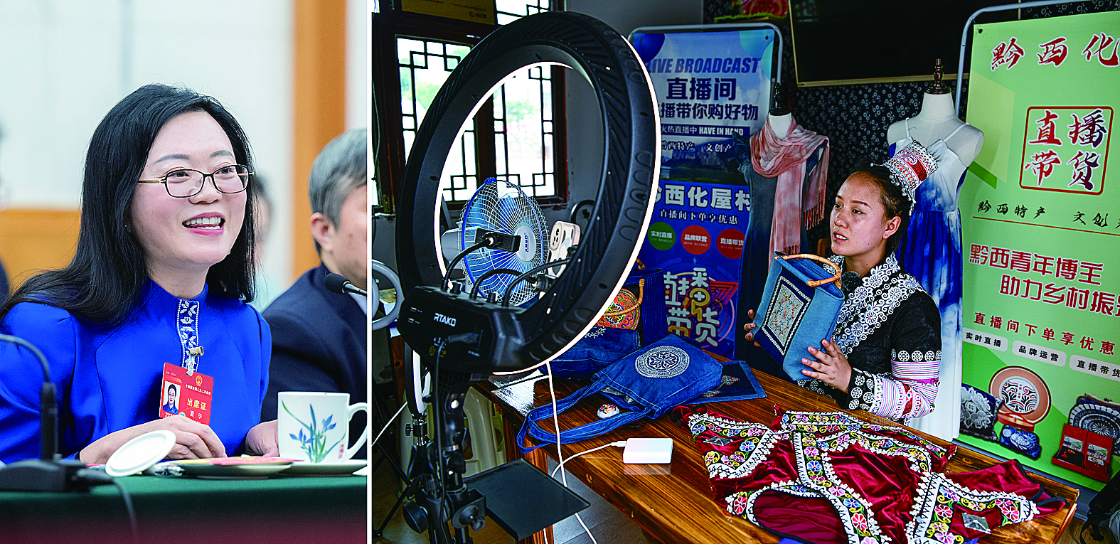 左图:全国人大代表夏华建议,让指尖技艺变成指尖经济。 右图:绣娘杨文丽在贵州省黔西市新仁苗族乡化屋村的文创产品直播间推介苗绣文创产品(2023年5月30日摄)。 新华社发
