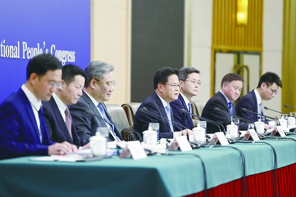 3月6日,十四届全国人大二次会议在北京梅地亚中心新闻发布厅举行记者会。国家发展和改革委员会主任郑栅洁(中)在回答记者提问。 新华社记者 费茂华 摄