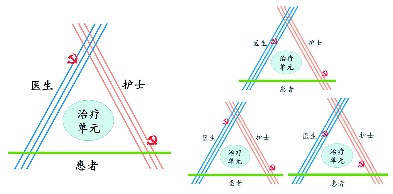 “三三制”人力资源配置管理模式借鉴了人民军队的建设理念,科室由科主任、治疗组、总住院三个主要单元组成,共设置三个治疗组,每个治疗组配置医生和护士,其中包括1名共产党员。