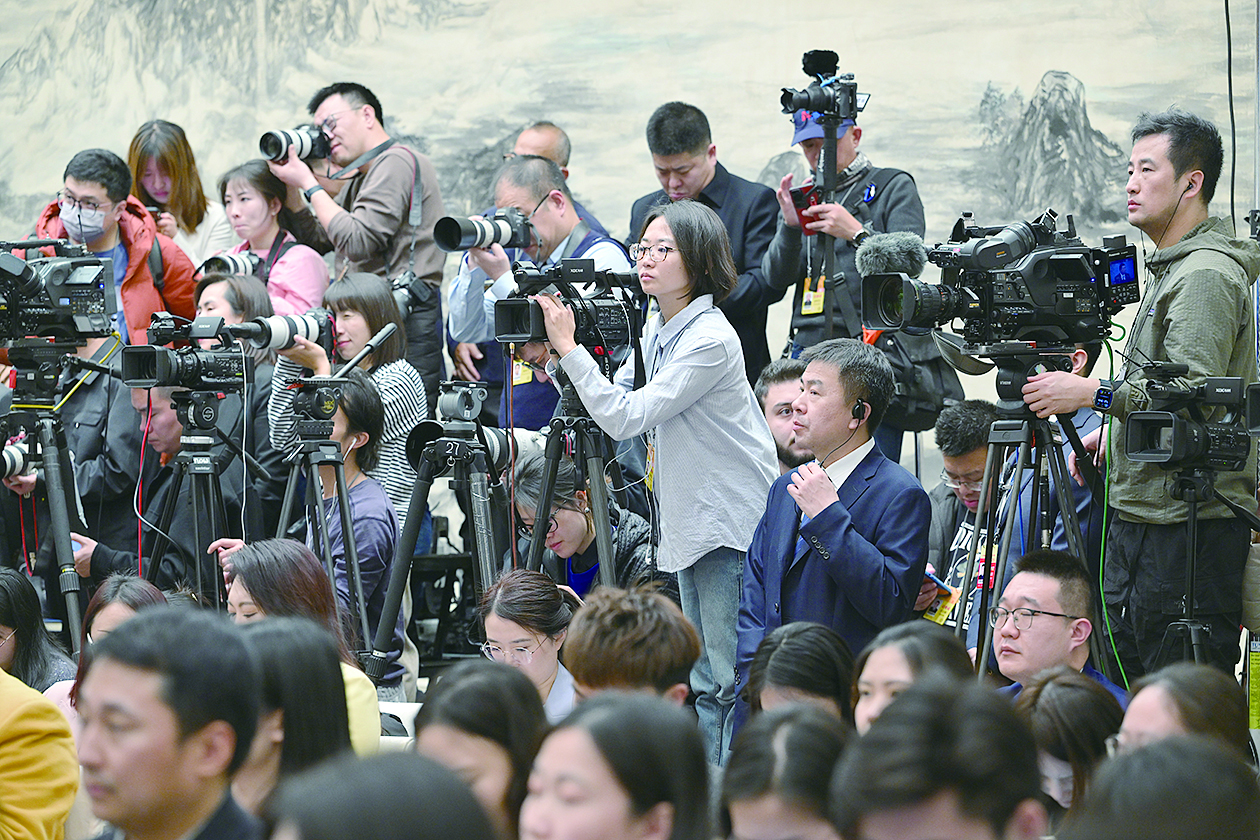 3月4日,十四届全国人大二次会议在北京人民大会堂举行新闻发布会。记者在发布会上采访。 新华社记者 才扬 摄