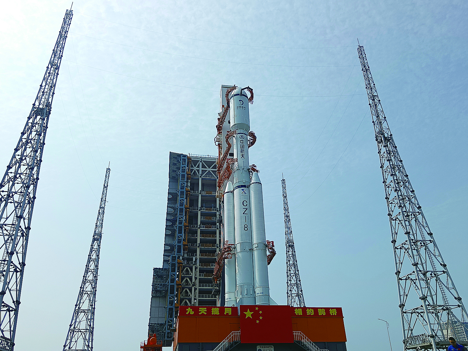 3月17日,探月工程四期鹊桥二号中继星和长征八号遥三运载火箭组合体在垂直转运中。新华社发