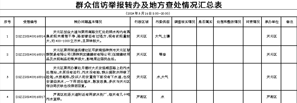 群众信访举报转办及地方查处情况汇总表