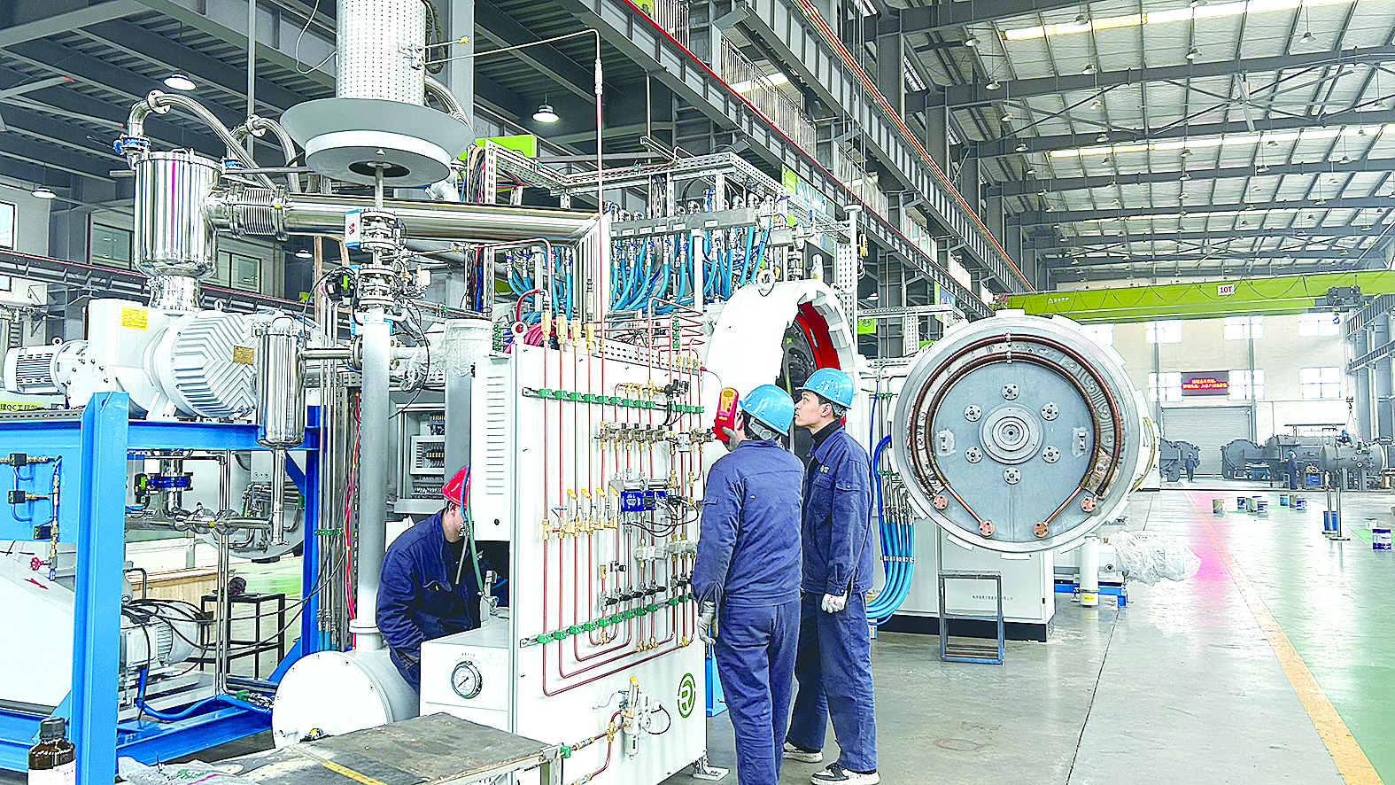 3月6日,在瑞德尔的生产车间,工人们正在用氦质谱检漏仪,对压力烧结炉进行漏点检测。