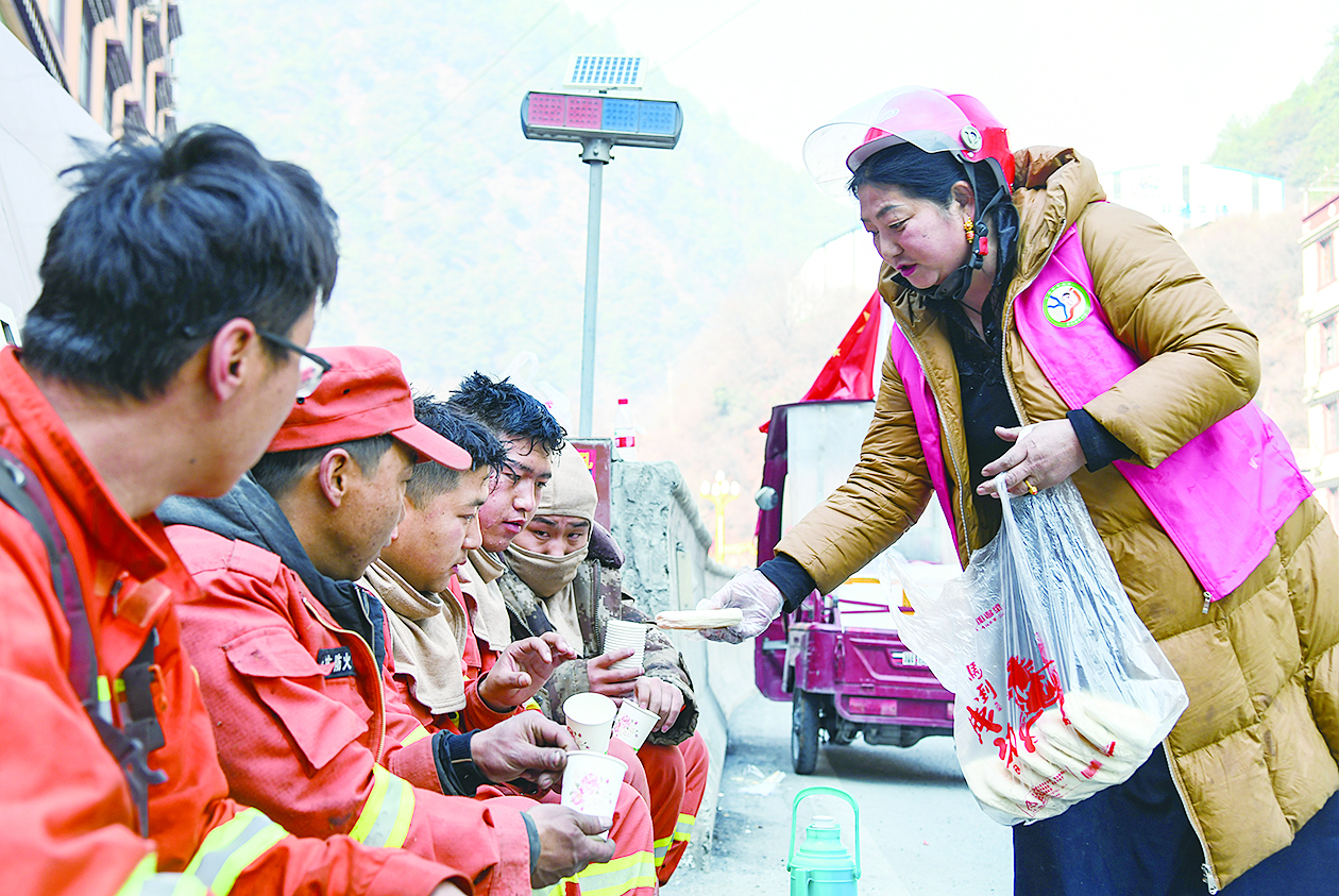 3月18日,在四川省甘孜藏族自治州雅江县,彭三妹(右)为刚从火场撤下来的消防员送上馍馍和热水。 今年55岁的藏族阿妈彭三妹家住四川省雅江县河口镇三道桥村。3月18日凌晨4点,彭三妹就起床做白面馍馍,做好后骑着三轮车,沿着318国道发给沿途从火场撤下来的消防员和防火卡点执勤人员、森林巡护员等,感谢他们做出的贡献。