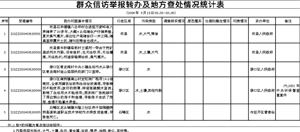 群众信访举报转办及地方查处情况统计表