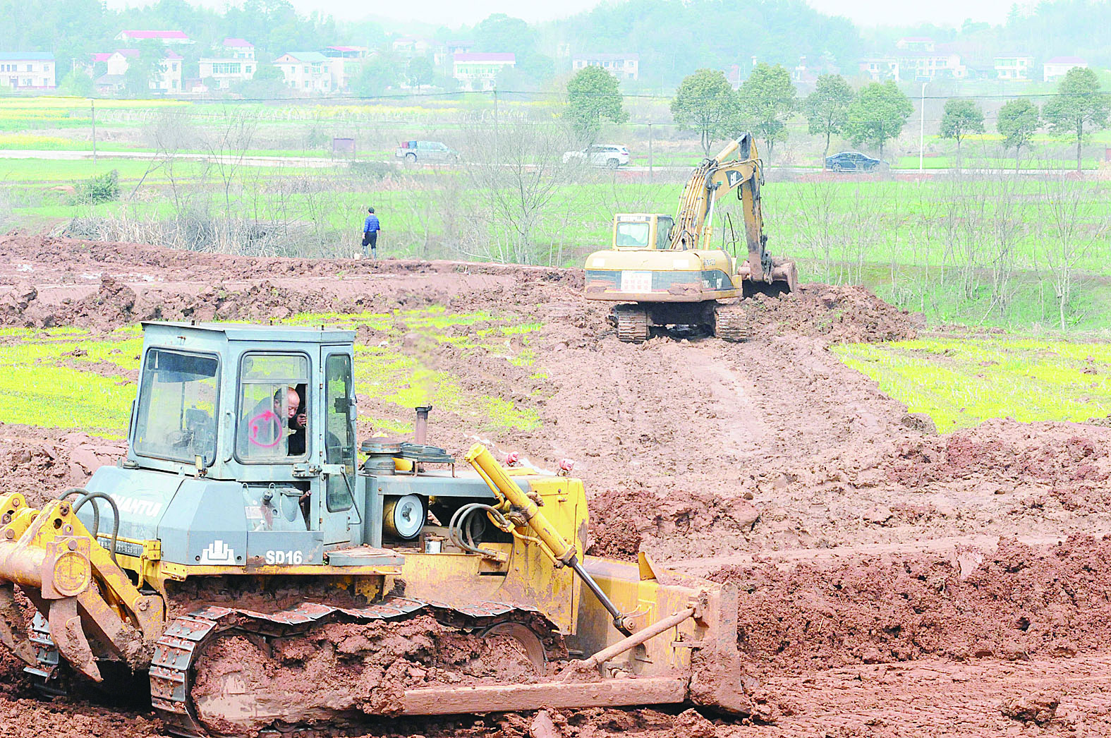 3月22日,记者站在黄田村河堤上,眼前平整后的农田一眼望不到边。8台挖掘机、推土机正在紧张作业。