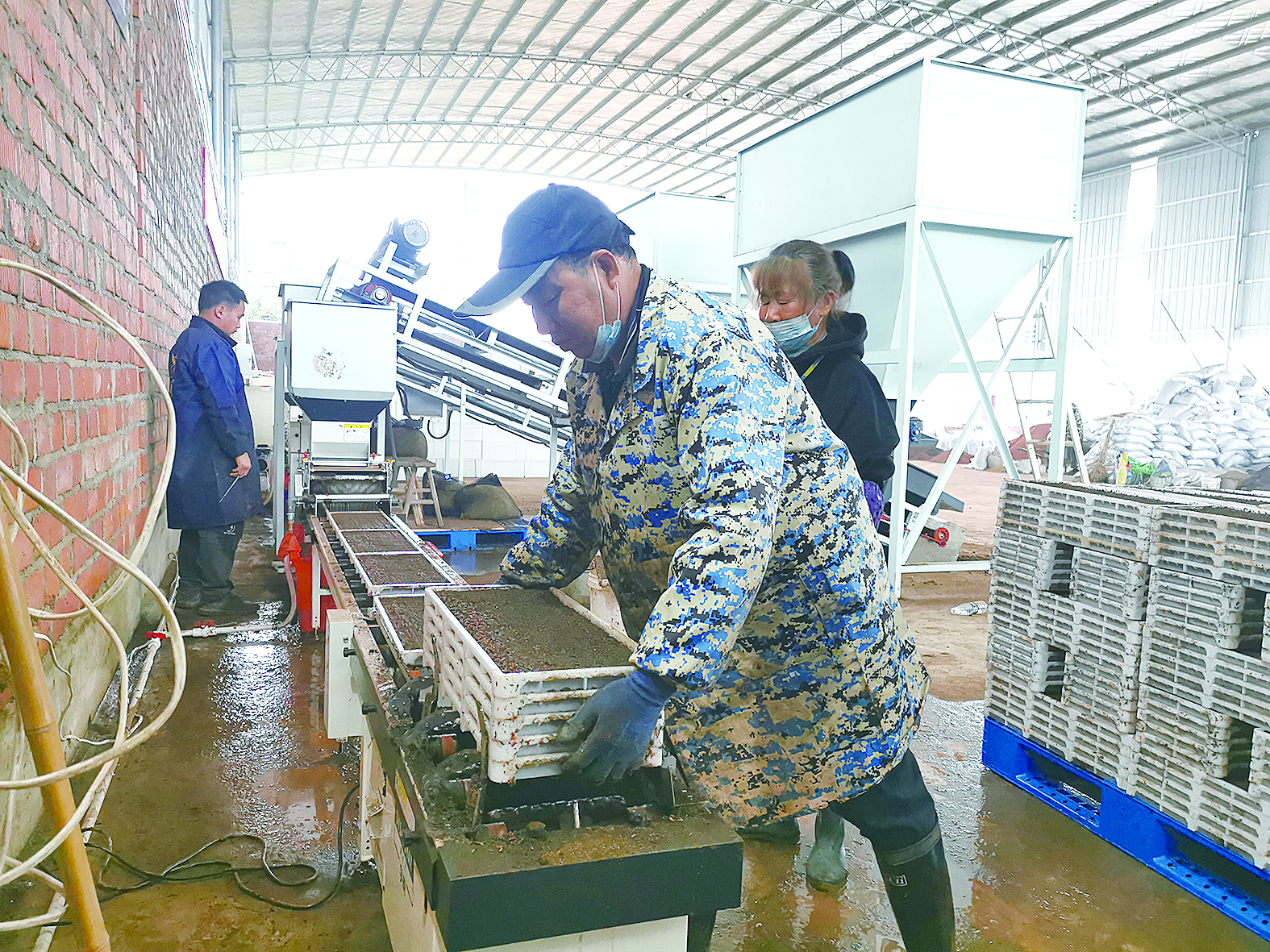 随着生产线的电源启动,经过消毒、浸种24小时的稻种,均匀地落在铺满基质土的育秧盘中,与水充分融合后再覆盖一层基质土,一个个精心打造的秧盘被推进暗室进行催芽。