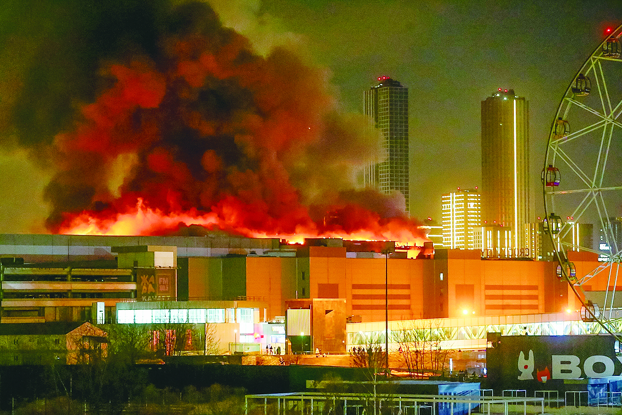 3月22日,在俄罗斯莫斯科近郊克拉斯诺戈尔斯克市拍摄的火光中的“克罗库斯城”音乐厅。 新华社/美联
