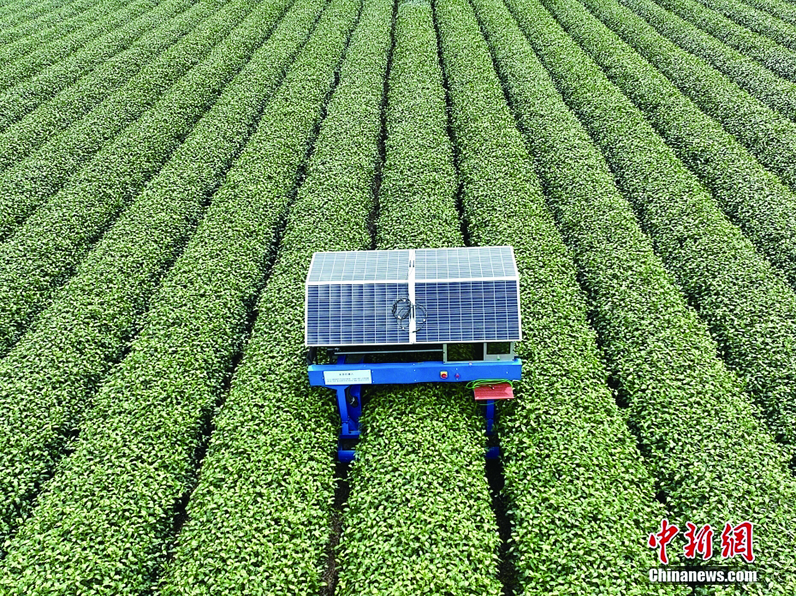 3月26日,智能采茶机器人在龙井茶园内采摘新茶。近日,随着浙江杭州明前西湖龙井茶开采,多台具备AI视觉识别、机械臂采摘等功能的智能采茶机器人“上班”采新茶。(无人机照片)