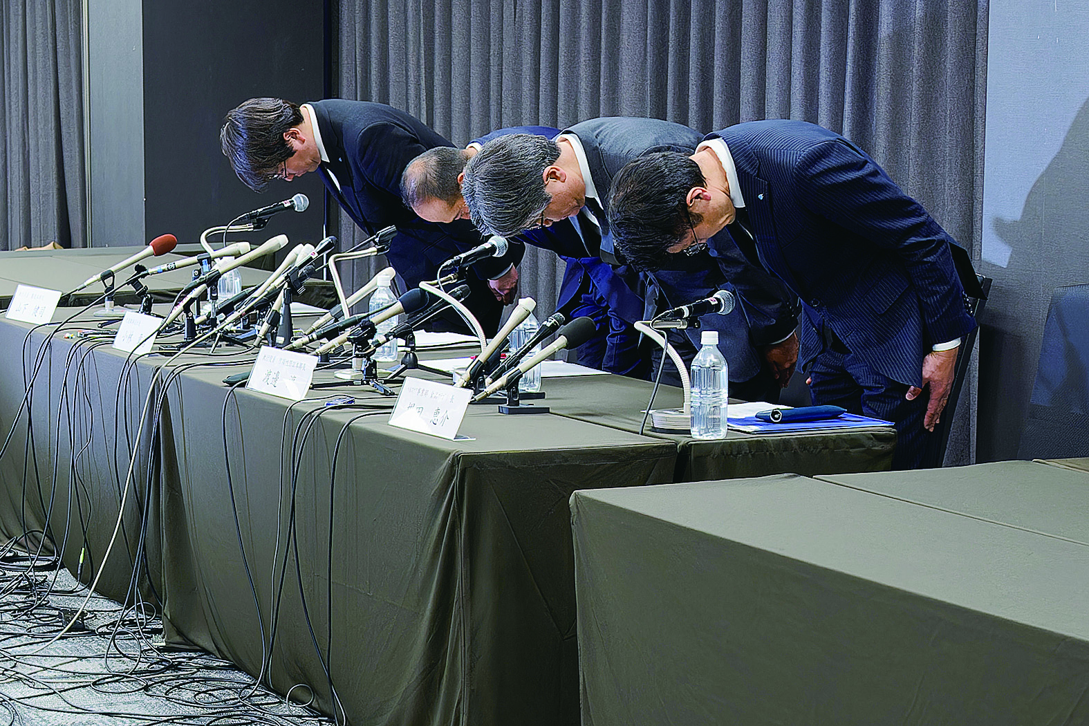 3月29日,小林制药公司社长小林章浩(左二)及相关负责人在日本大阪举行的新闻发布会上鞠躬。