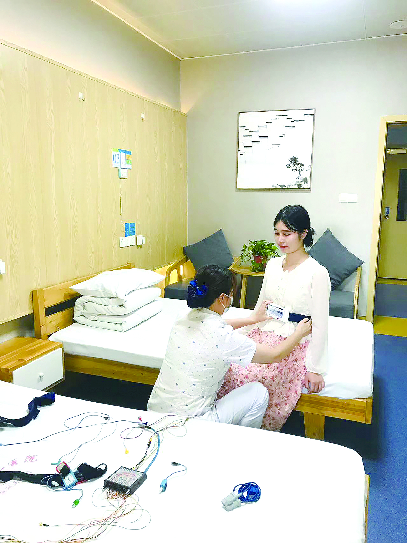 医护人员在给患者佩戴多导睡眠监测系统。