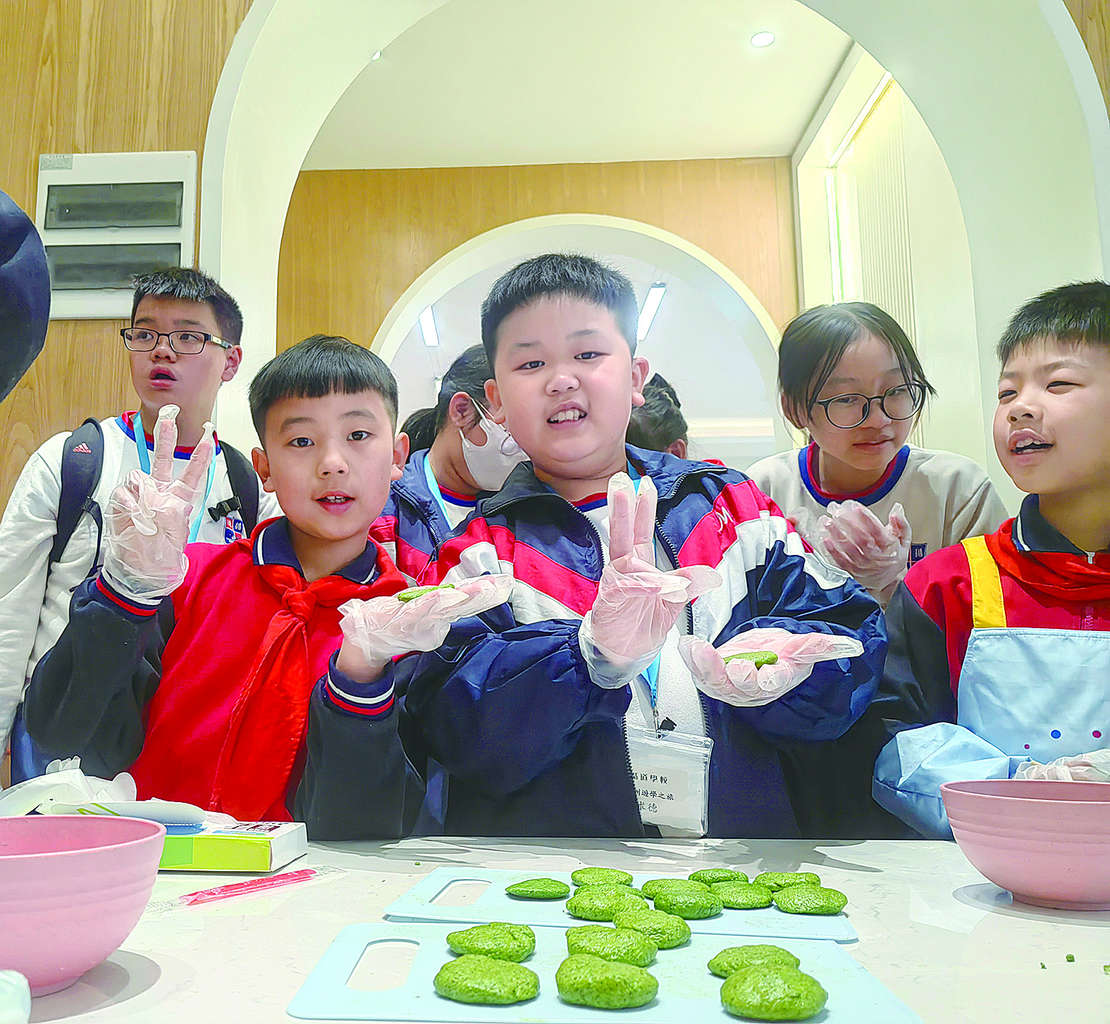 “港”“株”文化交流小使者一起制作“蒿子粑粑”。 记者/孙晓静 摄