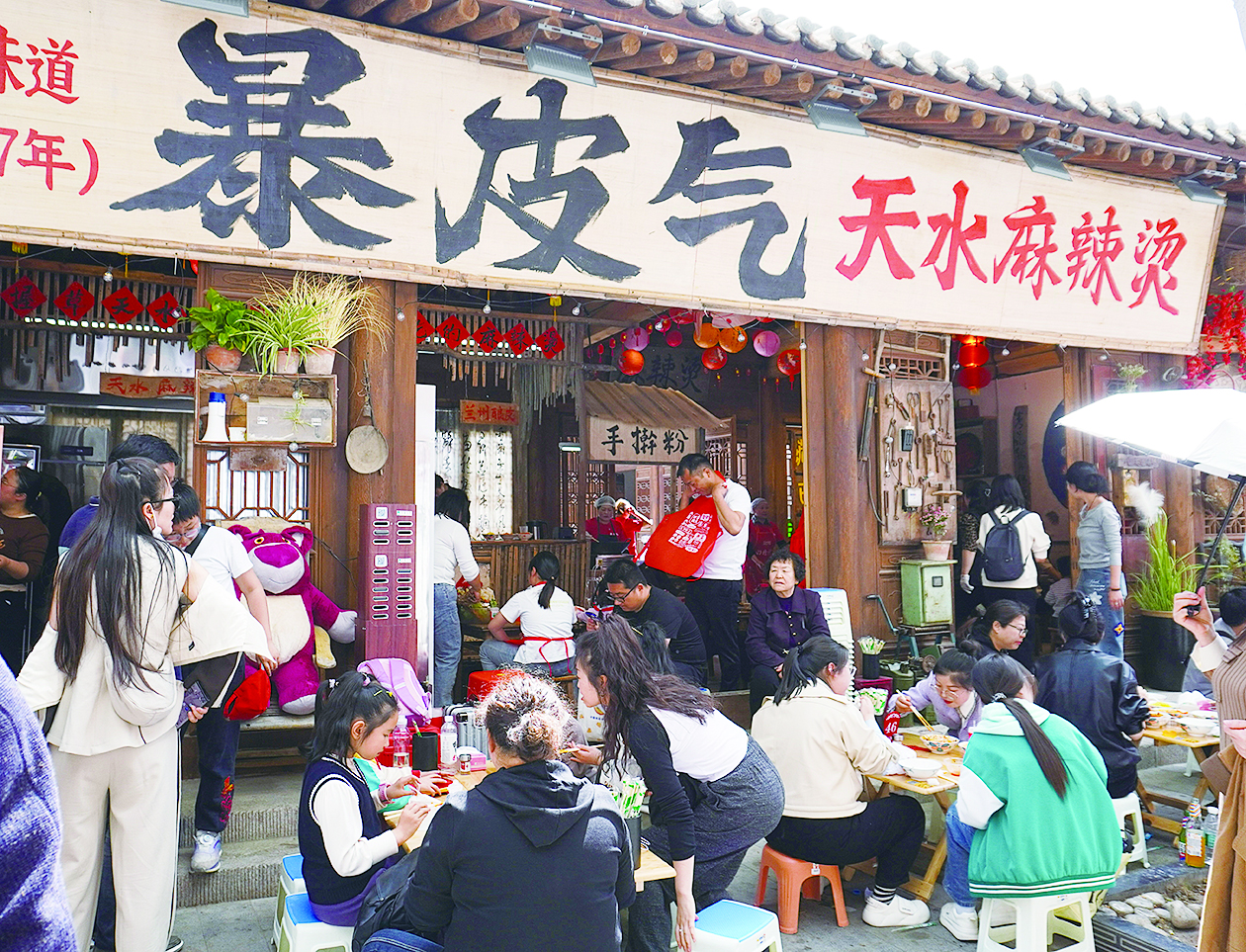 4日,游客在位于天水市秦州区的一家麻辣烫店吃麻辣烫。 新华社记者 马希平 摄