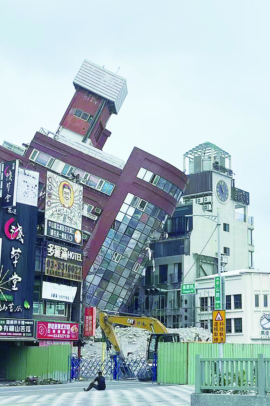 4月5日上午拍摄的位于花莲市区的天王星大楼。大楼将从正面玻璃开始,由上至下进行拆除。 新华社记者 赵博 摄