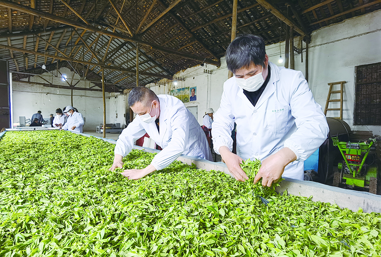 茶厂里,宏图村党委书记谢西武(右)正在摊青。