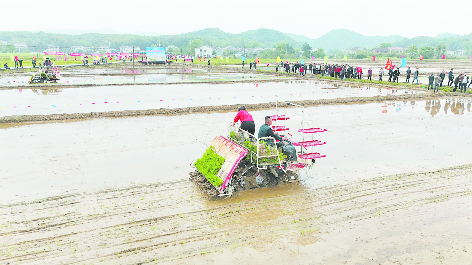 水田里插上了五颜六色的旗帜。选手们完成抽签、分组后,来到各自的“责任田”,将一筐筐嫩绿的秧苗搬上抛秧机,再仔细检查农机,现场的马达声轰鸣。