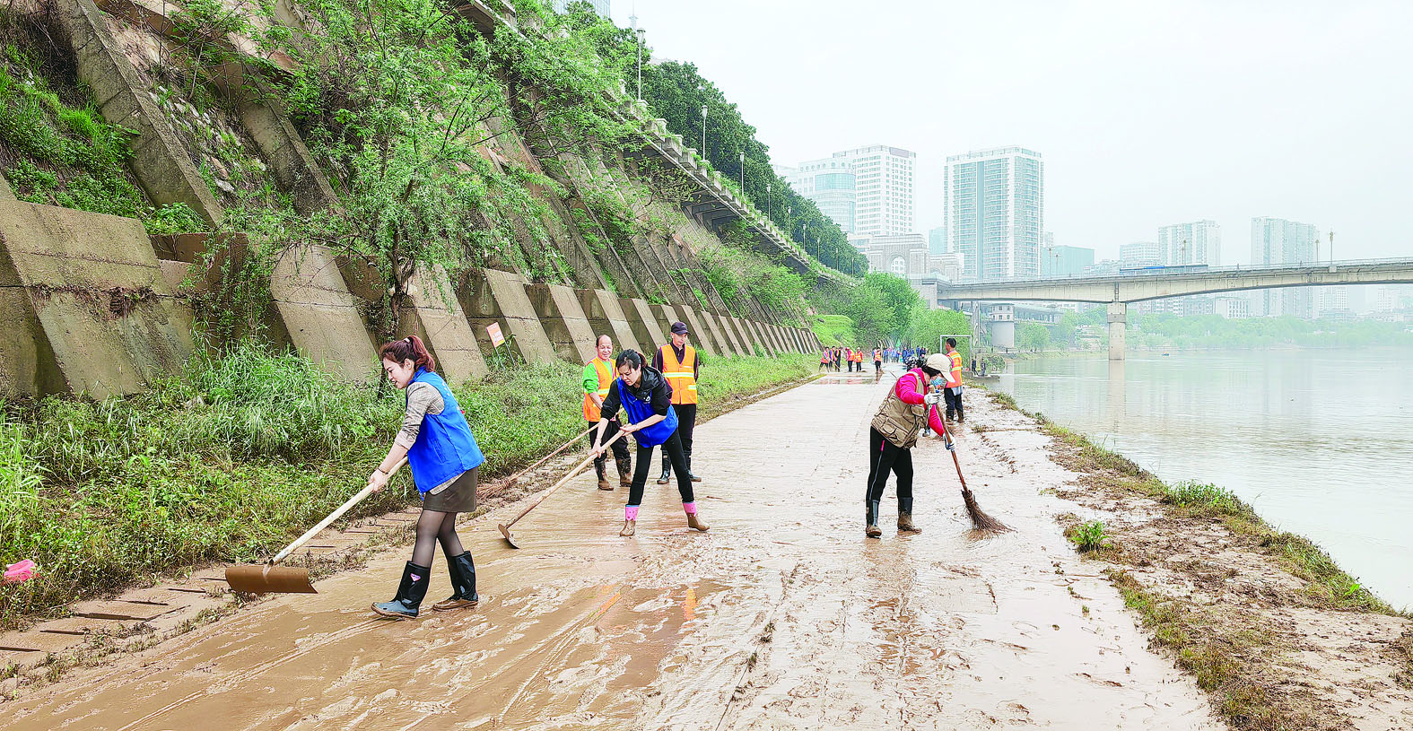4月12日,芦淞区河长办组织街道办、民间河长及“河小青”志愿者,对湘江风光带芦淞段河岸淤泥进行冲洗,并清理河边树木上悬挂的垃圾漂浮物。