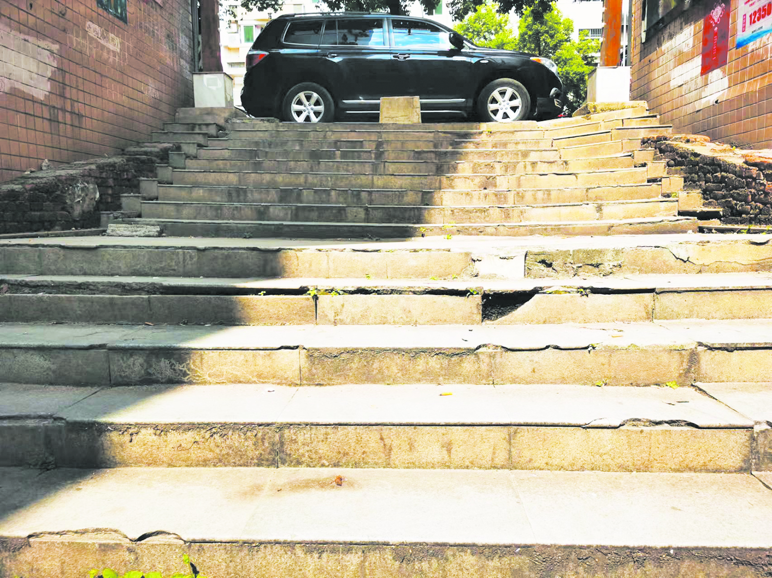 ①改造前的锻压新区台阶,不仅破损,且多处下沉。 社区供图