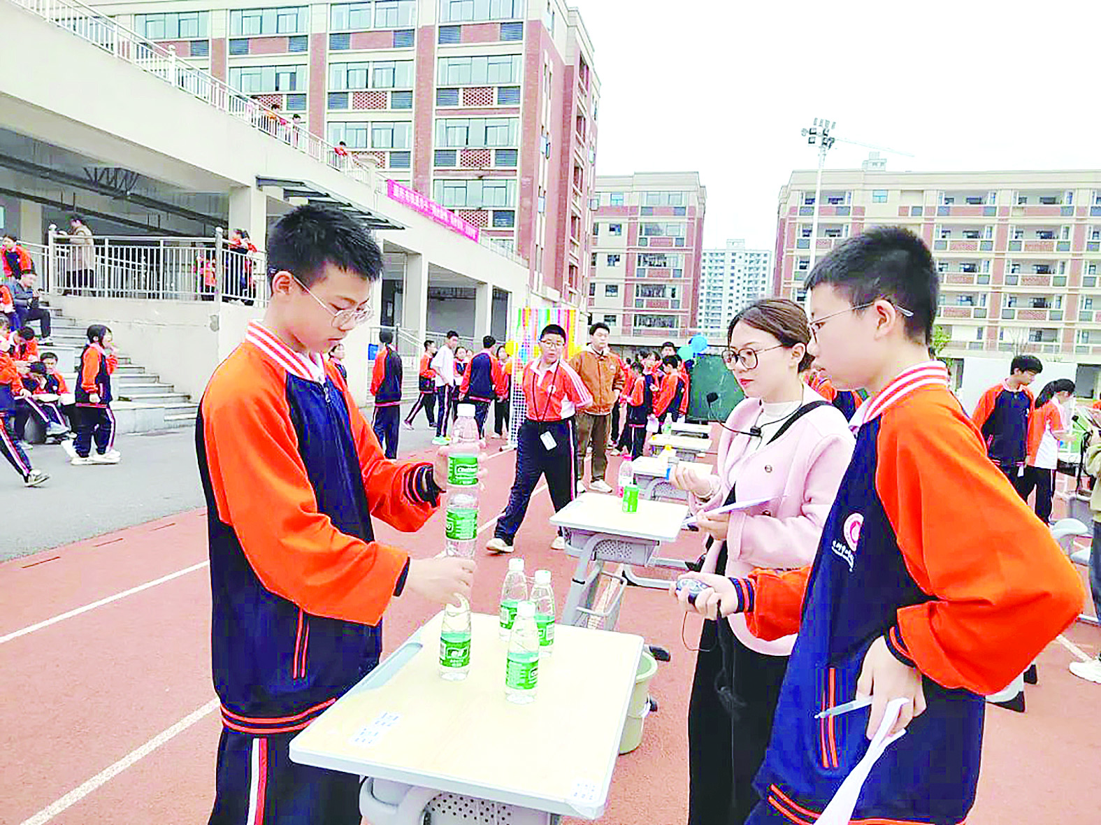 用地理知识来一次校园探宝,用多米诺骨牌搭出有趣的图形,用美味水果为灯发电……日前,株洲市二中枫溪学校初中部第二届科技节启动。活动中,同学们利用各科所学习的知识,参与各种科学探究、实验活动,让大家在游戏中感受知识的魅力。图为同学们参加物理知识闯关活动。