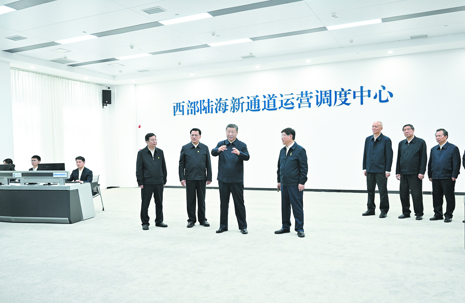 22日下午,习近平首先考察了重庆国际物流枢纽园区。他来到西部陆海新通道重庆无水港运营调度中心,听取新通道建设情况汇报。习近平强调,物流是实体经济的“筋络”。建设西部陆海新通道,对于推动形成“陆海内外联动、东西双向互济”的对外开放格局具有重要意义。各有关方面要齐心协力,把这一标志性项目建设好、运营好,带动西部和内陆地区高水平对外开放。物流园区要积极运用先进技术,不断创新联运模式,提高科学管理水平,在建设现代物流体系中发挥更大作用。