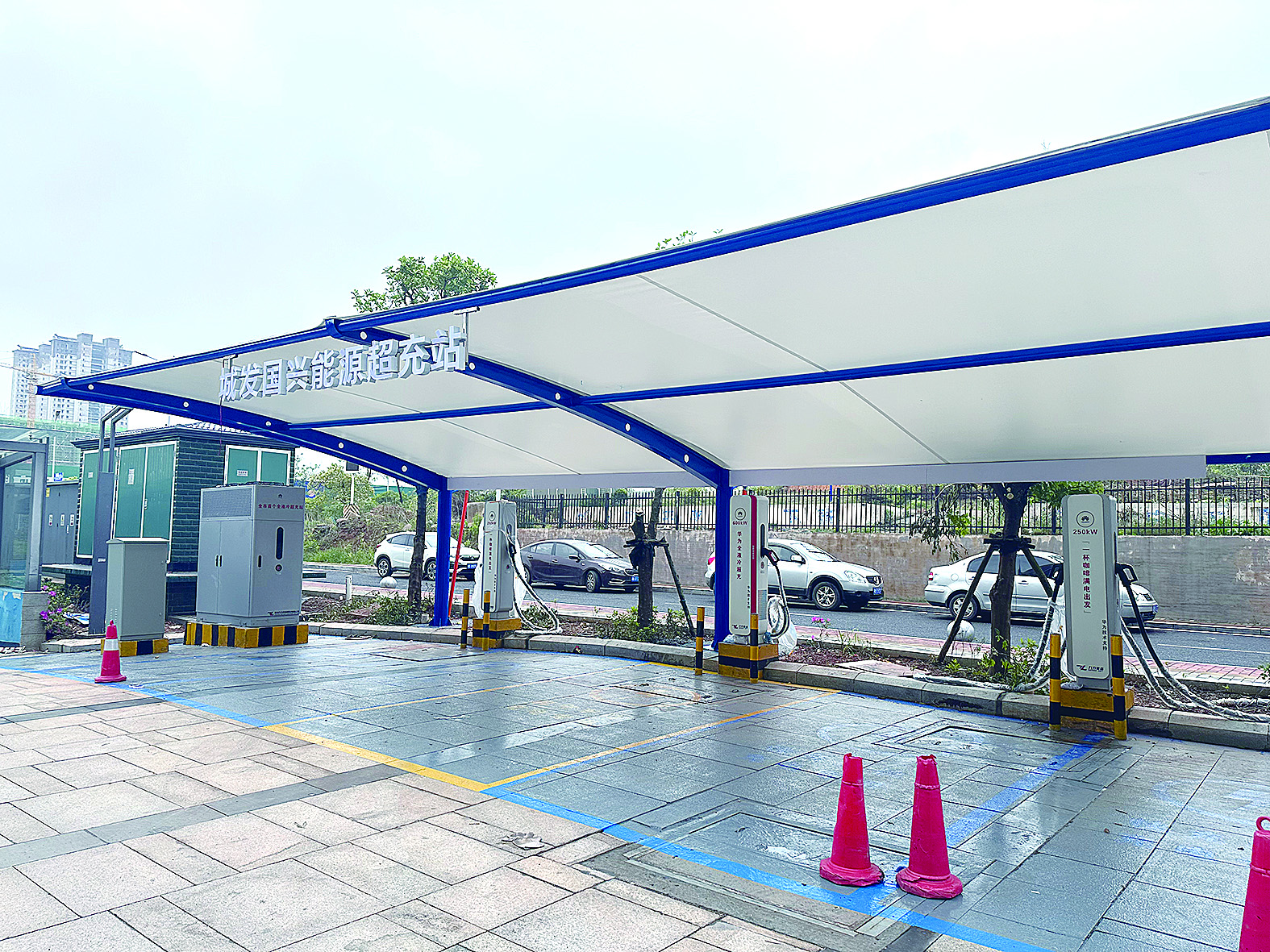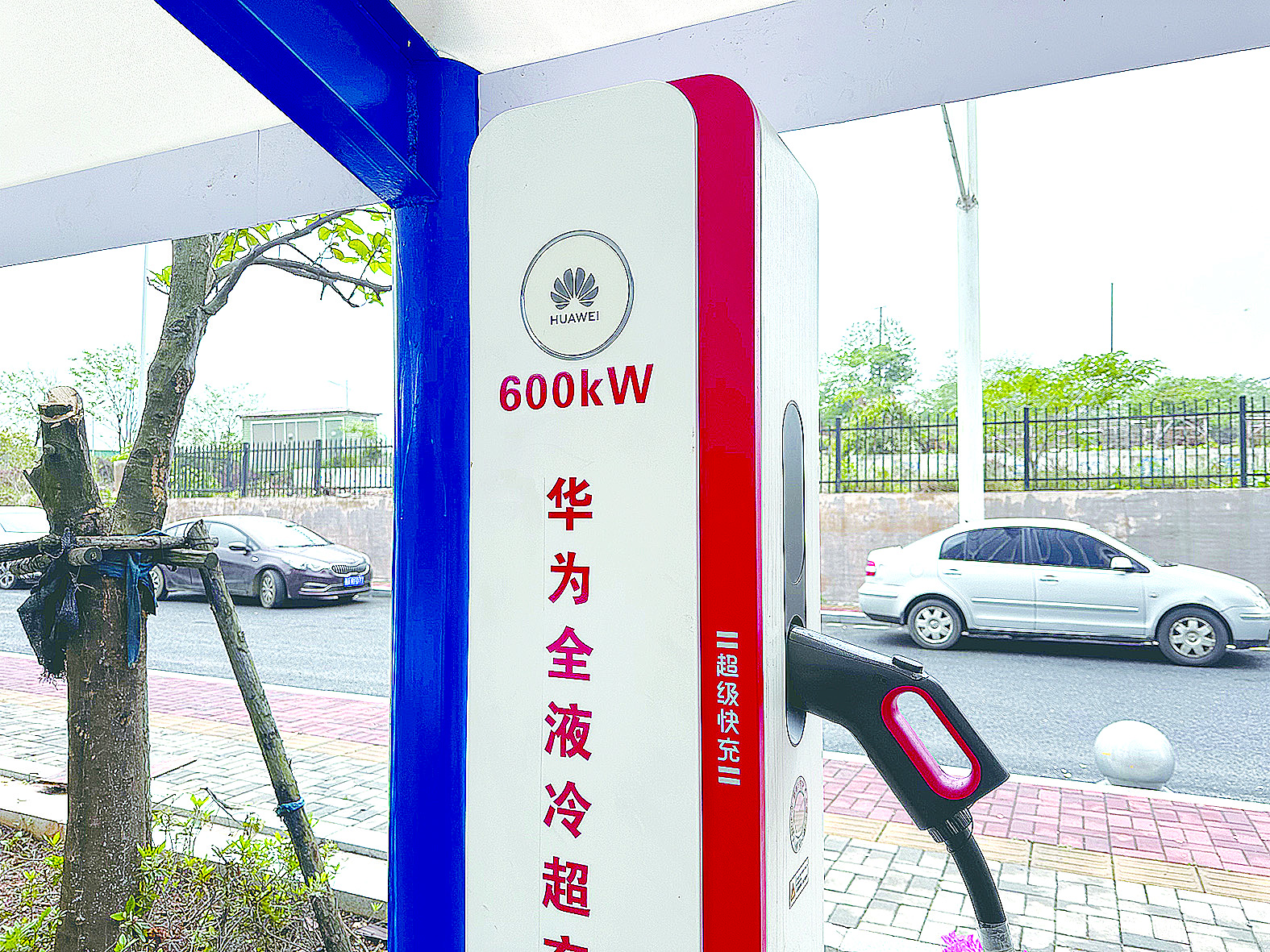 白篷蓝底,6根崭新的充电桩一字排开,该超充站占地面积100多平方米,共有11个充电车位,包含1个华为液冷超充车位、10个华为快充车位,可满足当前市面上所有车型的充电需求。