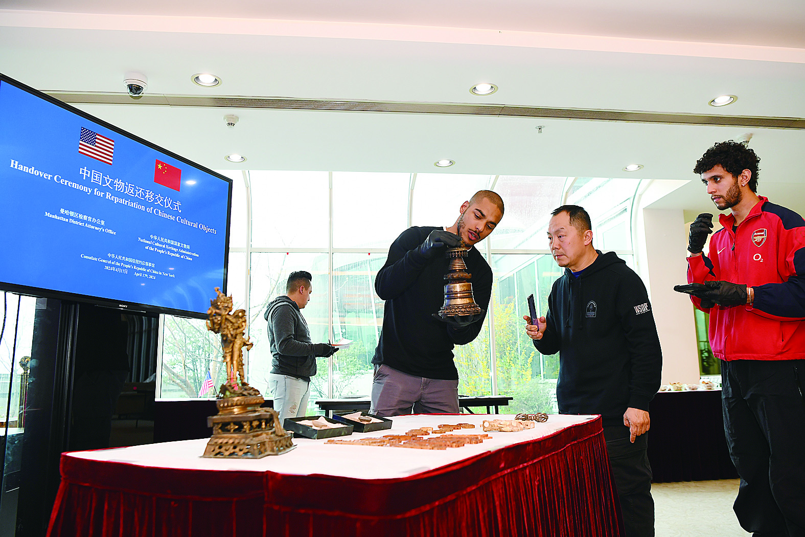 4月17日,在美国纽约中国驻纽约总领馆,工作人员点交中国流失文物艺术品。新华社发