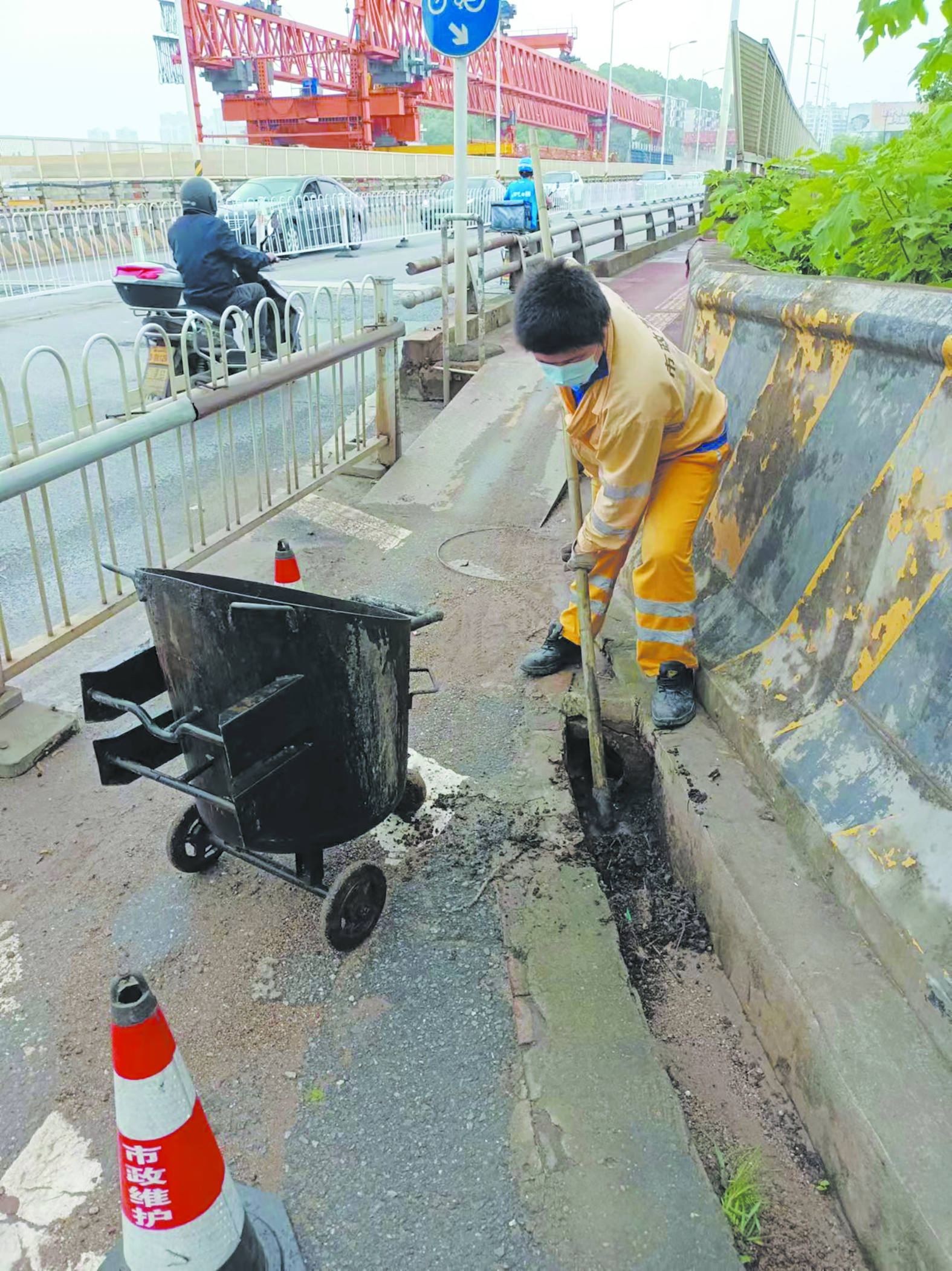 当天,市政工程维护中心组织全体养护队员,到城区各重点路段、易积水点开展排水设施清淤疏浚和检修。