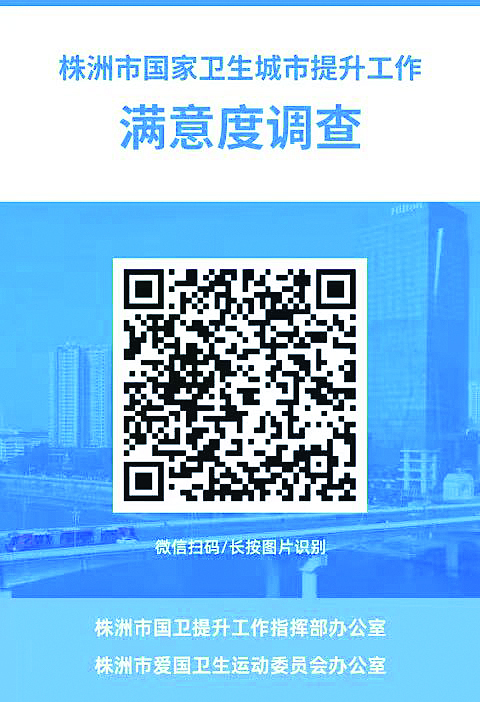 “您对株洲市健康教育和健康宣传氛围满意吗?”“您对株洲市中心城区市政环卫等硬件设施建设和卫生管理现状满意吗?”市民朋友们可扫描网络问卷调查二维码,进入“株洲市国家卫生城市提升工作满意度调查”页面进行评价。健康、安全、舒适的生活环境,需要我们的共同努力。