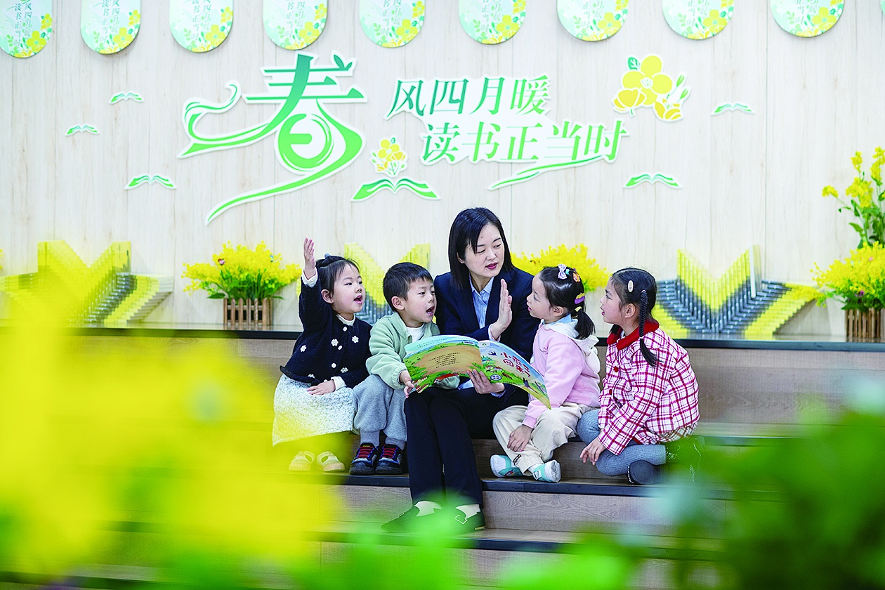 4月22日,在江苏省兴化市昭阳街道的一家新华书店内,阅读推广人跟孩子们分享故事。 新华社发(周社根 摄)