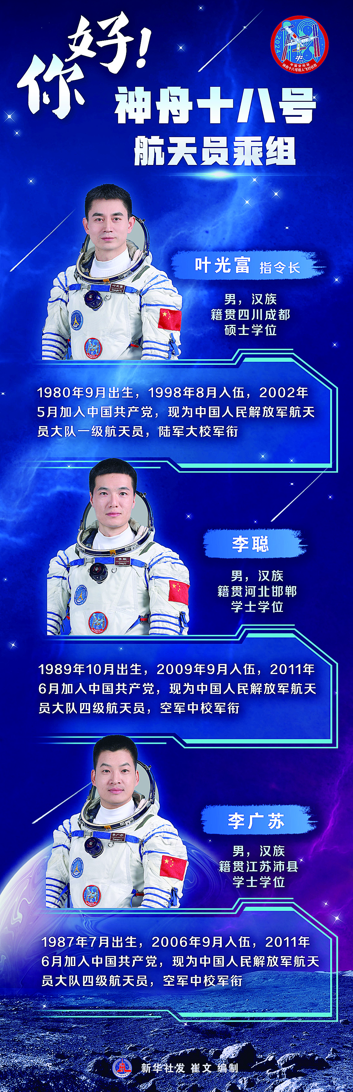 执行神舟十八号载人飞行任务的航天员乘组由叶光富、李聪、李广苏3名航天员组成,叶光富担任指令长。乘组包括1名第二批航天员和2名第三批航天员,3人均为“80后”。