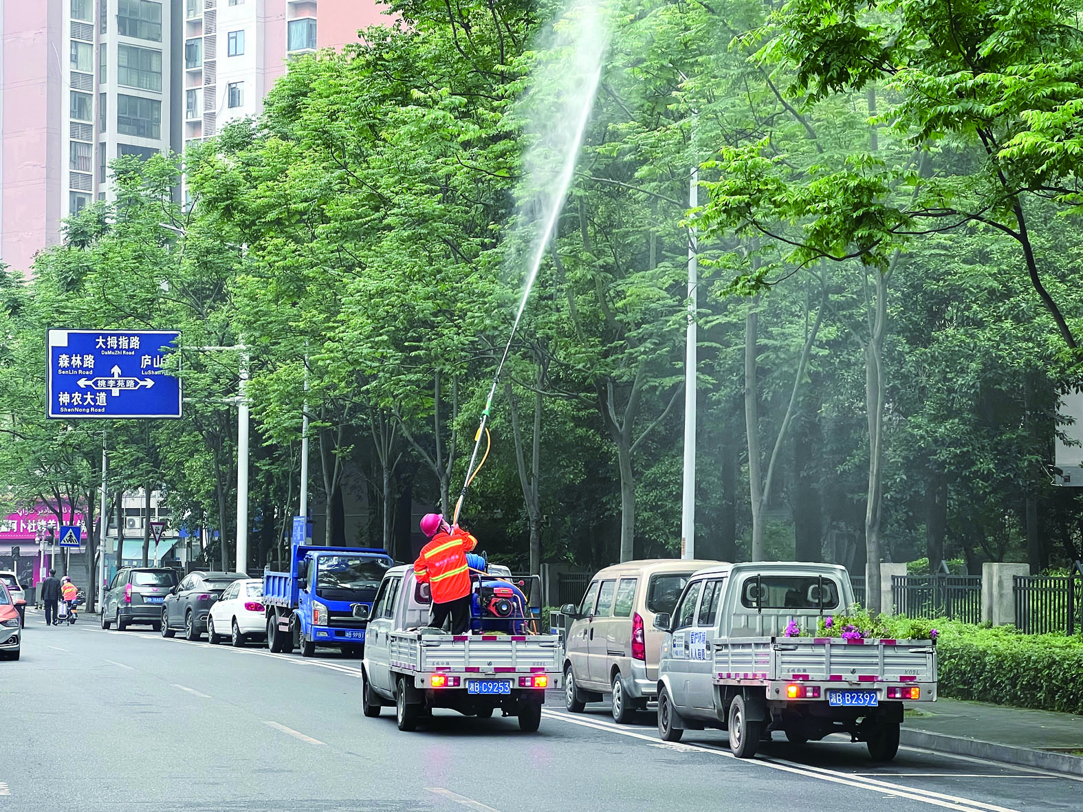 工人正在庐山春天路给栾树打农药。 记者/姚时美 摄