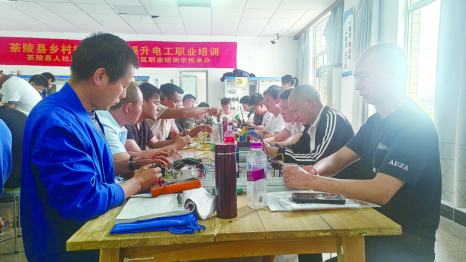 在三楼教室里,电工培训班的学员正在紧张地进行接线实操。学员曹位兵来自桃坑乡,今年39岁的他此前在建筑工地做泥工,从村里微信群获悉县里将举办电工培训班,他果断报名,从最基础的导线连接开始学习,逐步熟悉照明电路的控制、电路图、安全用电等知识。