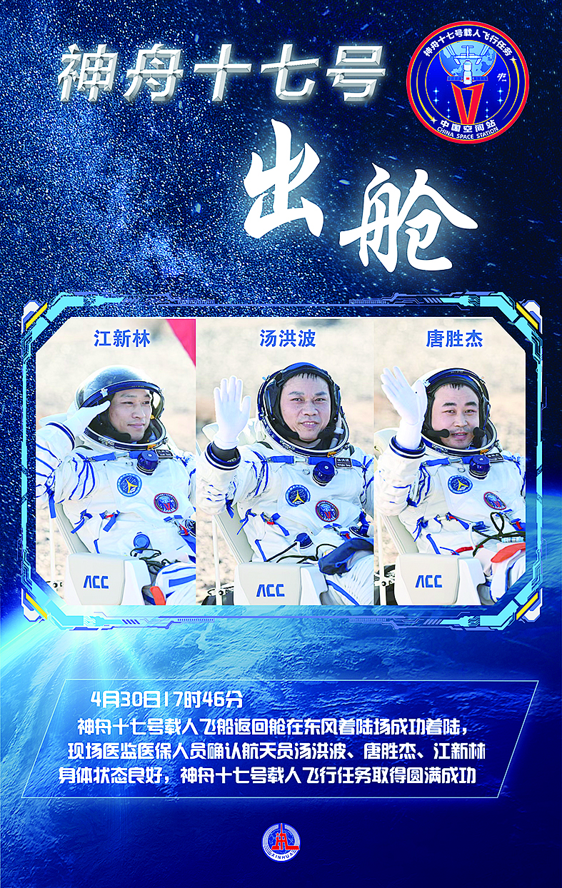 4月30日18时37分,神舟十七号航天员汤洪波、唐胜杰、江新林全部安全顺利出舱,健康状态良好。新华社发 卢哲 贝赫 编制