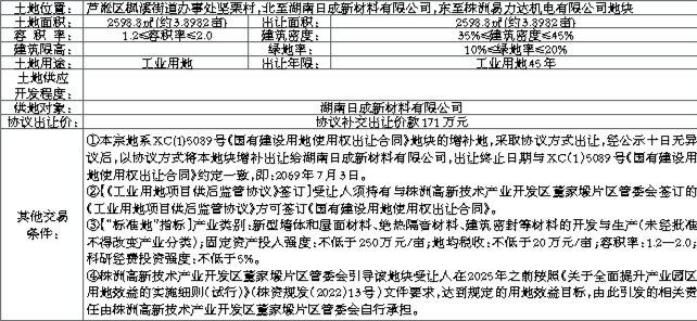 位于芦淞区枫溪街道办事处坚栗村,北至湖南日成新材料有限公司,东至株洲易力达机电有限公司地块一宗工业用地的出让方案已经芦淞区人民政府批准。从即日起向社会公开发布公告,公示期十日。主要内容如下: