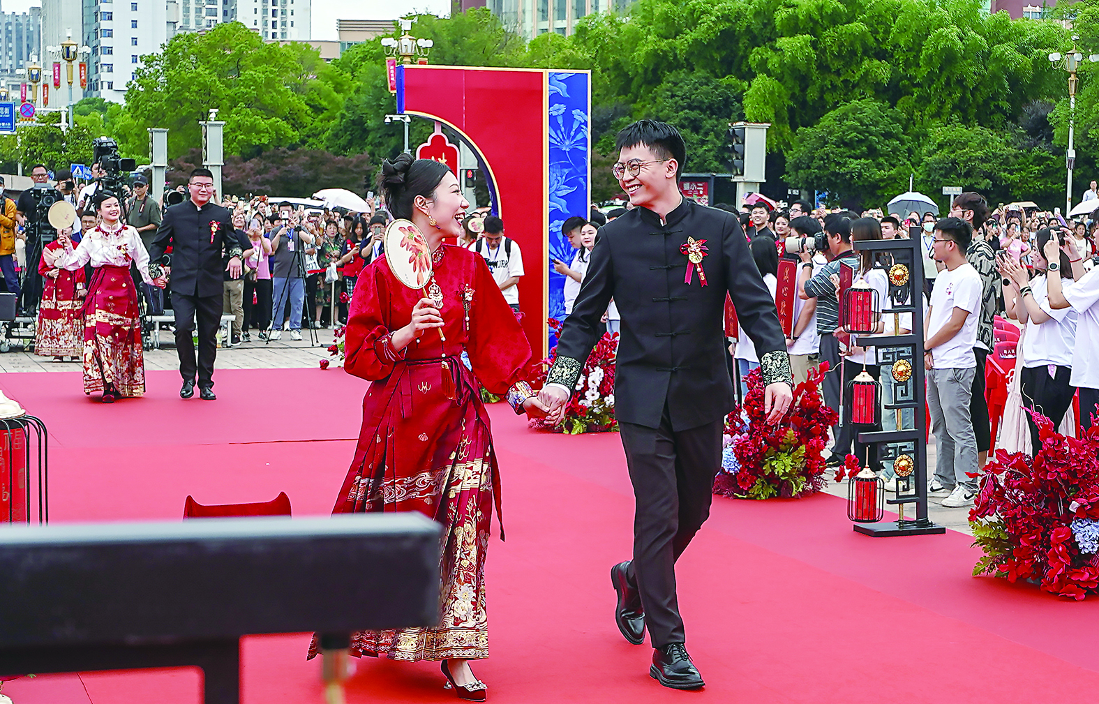 婚礼主打国潮风,处处可见株洲元素。50对新人身着株洲企业量身定制的国潮喜服,在神农坛参加祈福礼后,乘坐智轨花车来到神农城婚礼现场。集体婚礼分为囍来相见、囍爱加倍、囍悦长守三个篇章。