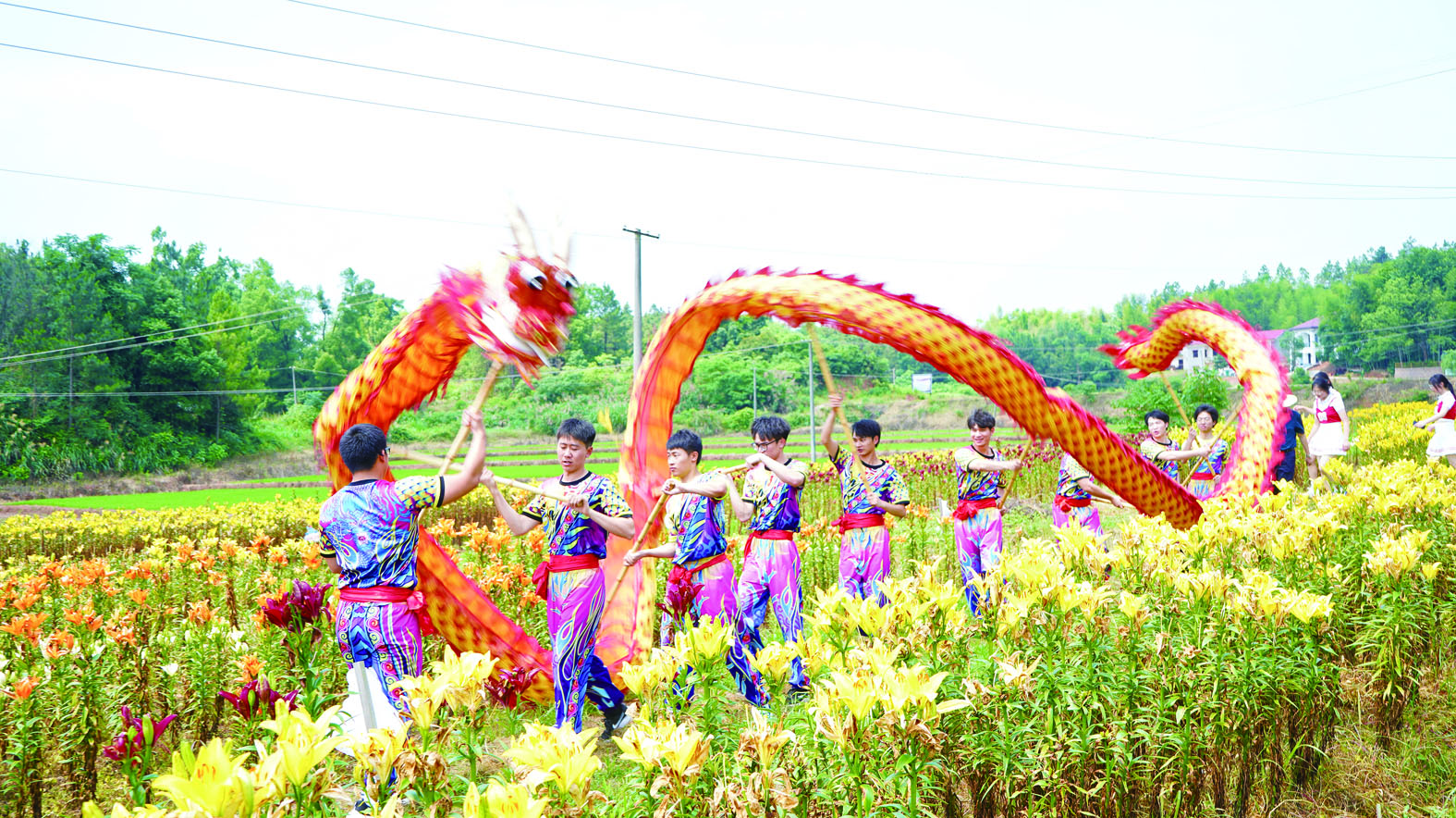 5月26日,舞龙队穿行于美丽的百合花丛间。 肖霜 摄