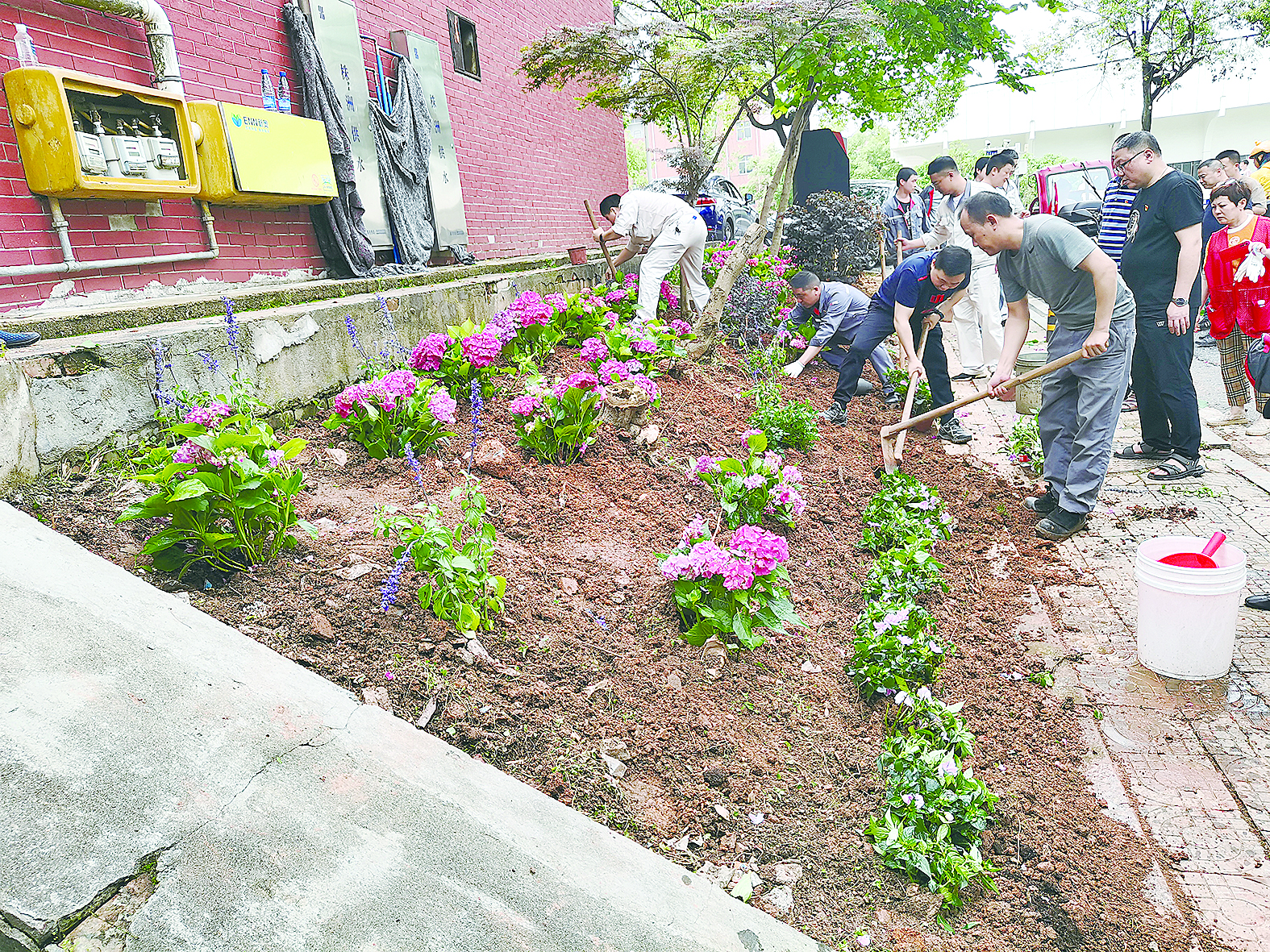 株洲日报讯(全媒体记者/李逸峰 通讯员/李淇) 5月12日一大早,石峰区田心街道芙蓉小区“一米花园”环境微改造启动。在园林绿化专家的指导下,中车株洲电力机车有限公司(以下简称“中车株机”)七彩志愿服务队、社区网格员和小区居民齐心协力,为小区栽种下三角梅、绣球、月季共500株绿植,并对小区主干道花坛进行全面清理和美化。经过一上午的努力,小区面貌焕然一新,居民喜笑颜开。