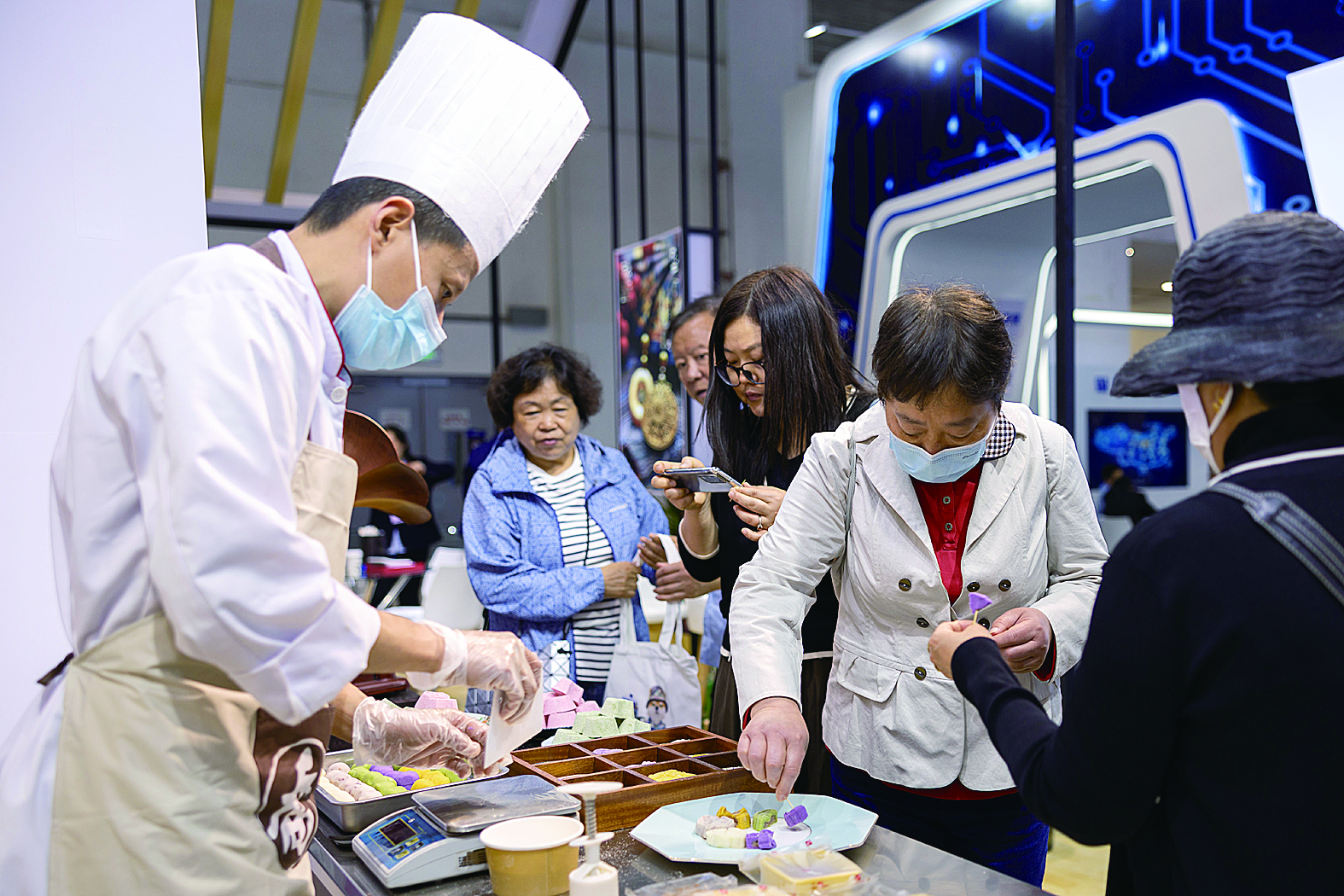5月13日,观众在中华老字号“乔家栅”展位品尝试吃现场制作的糕点。 正在上海举办的中国品牌博览会上,来自全国各地的优质老字号品牌企业齐聚一堂,通过现场展销、试吃品尝、直播带货等形式,展示优质产品。