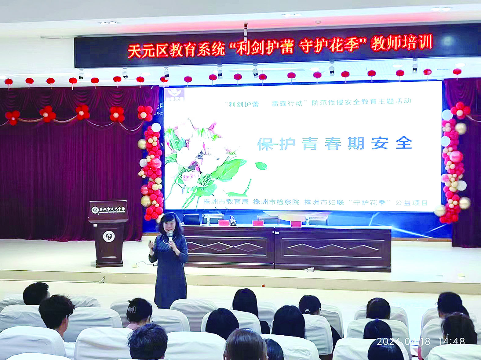 今年以来,市教育局出台《株洲市教育局利剑护蕾·雷霆行动工作方案》,先后4次召开系统会议专题部署,明确各部门职责。各级各类学校结合自身实际,建立防性侵的专项制度,明确学校分管女生工作的副校长。组织全系统专题培训2次,各县市区教育局、市直各学校、民办培训机构等相关负责人共近1000人参加学习。举办了《未成年保护和强制报告制度》的专题学习。叶蜜律师用鲜活的案例深入浅出地讲述了强制报告制度适用的情形,特定的主体如何实施强制报告制度等。市教育局政策法规与规划科科长谭望,详细解读了猥亵罪的法律定义及表现形式,尤其强调了隔空猥亵已经入罪。坚持公益宣讲,下发《关于组织2024年“守护花季”儿童权益公益活动的通知》,将守护花季青少年发展中心开展未成年防性侵公益课程,纳入株洲市教育局“利剑护蕾·雷霆行动”工作方案。目前,该公益组织已经在学校开展150多场防性侵专题公益讲座,覆盖30多万师生员工。